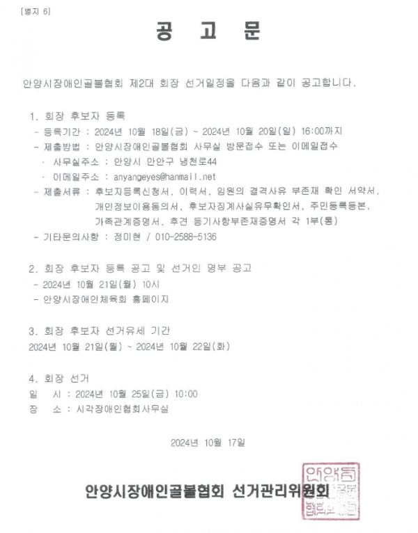 안양시 장애인 골볼협회 회장 선거 공고 페이지 정보 작성자 홍은기 주임 작성일24-10-17 16:20 조회594회 댓글0건 첨부파일 후보자 등록 서류.hwp (64.0K / 27회 다운로드) 관련링크 본문 안양시 장애인 골볼협회 회장 선거 공고 댓글목록 등록된 댓글이 없습니다. 이전글 다음글 목록 답변